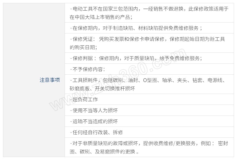 ·电动工具不在国家三包范围内,一经销售不做退换,此保修政策适用于在中国大陆上市销售的产品; ·在保修期内,对于制造缺陷、材料缺陷提供免费维修服务 ; ·保修凭证: 凭购买发票和保修卡申请保修,保修期起始日期为新工具的购买日期; ·保修判据 :保修期内,对于质量缺陷,给予免费维修服务; ·不予保修内容: ·工具损耗件,包括碳刷、油封、O型圈、轴承、夹头、钻套、电源线、砂磨底板、开关切换推杆损坏 ·超负荷工作 ·使用不当等人为损坏 ·运输不当造成的损坏 ·任何经自行改装、拆修 ·对于非质量缺陷的故障或损坏,提供收费维修/更换服务,例如 : 密封圈、碳刷、及易磨损件的更换 。