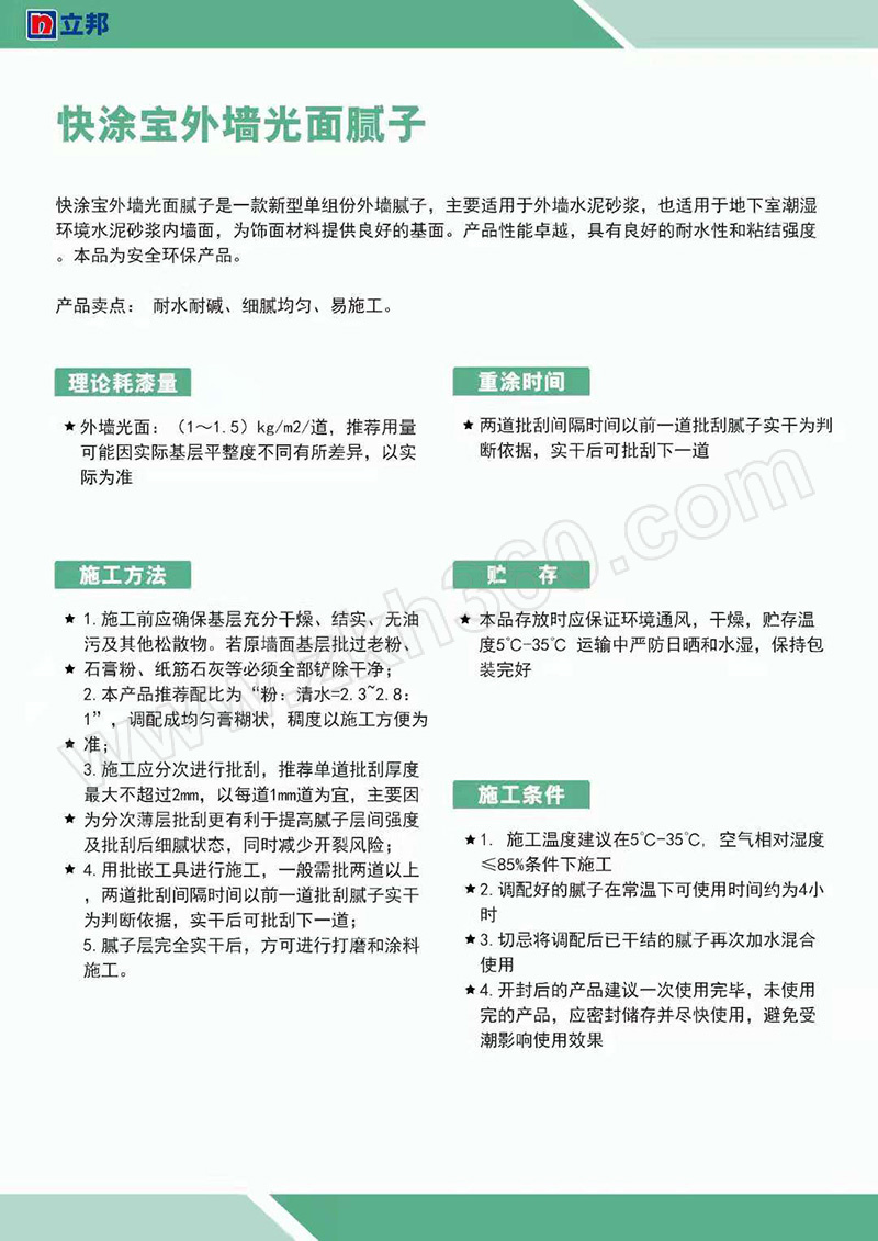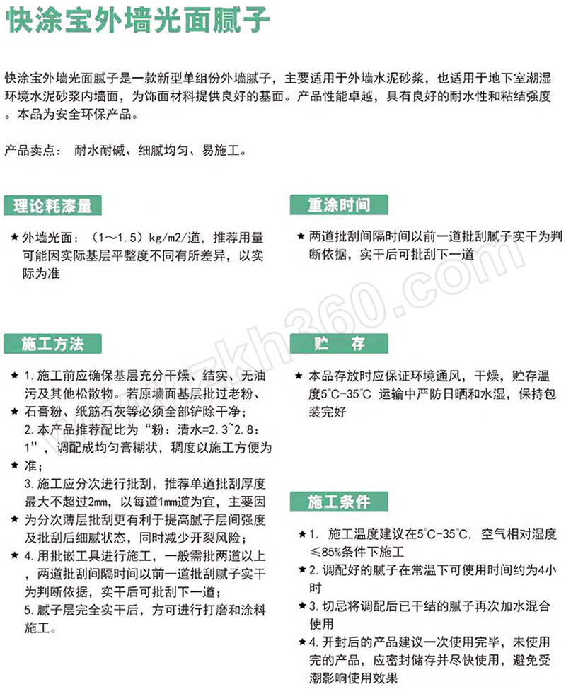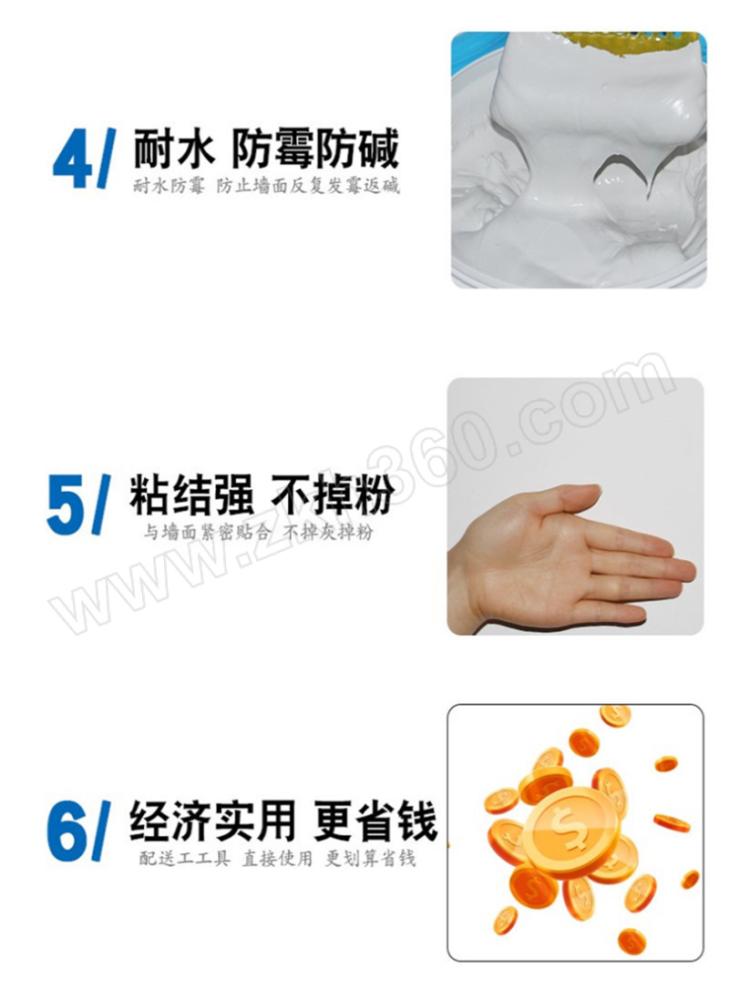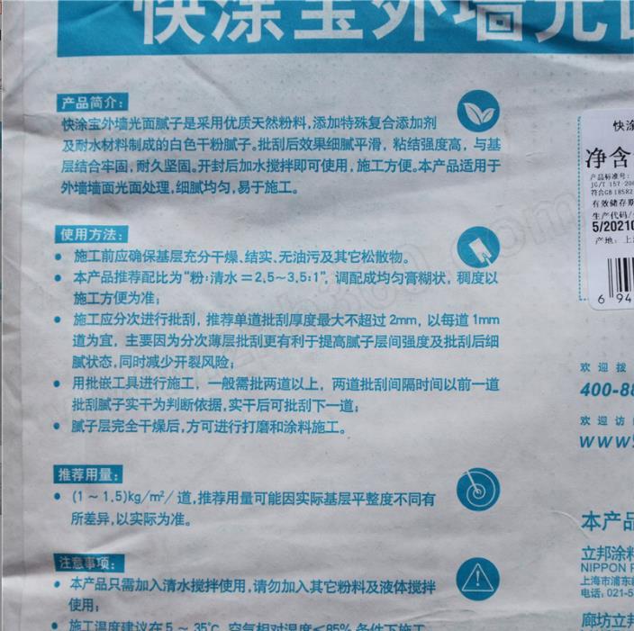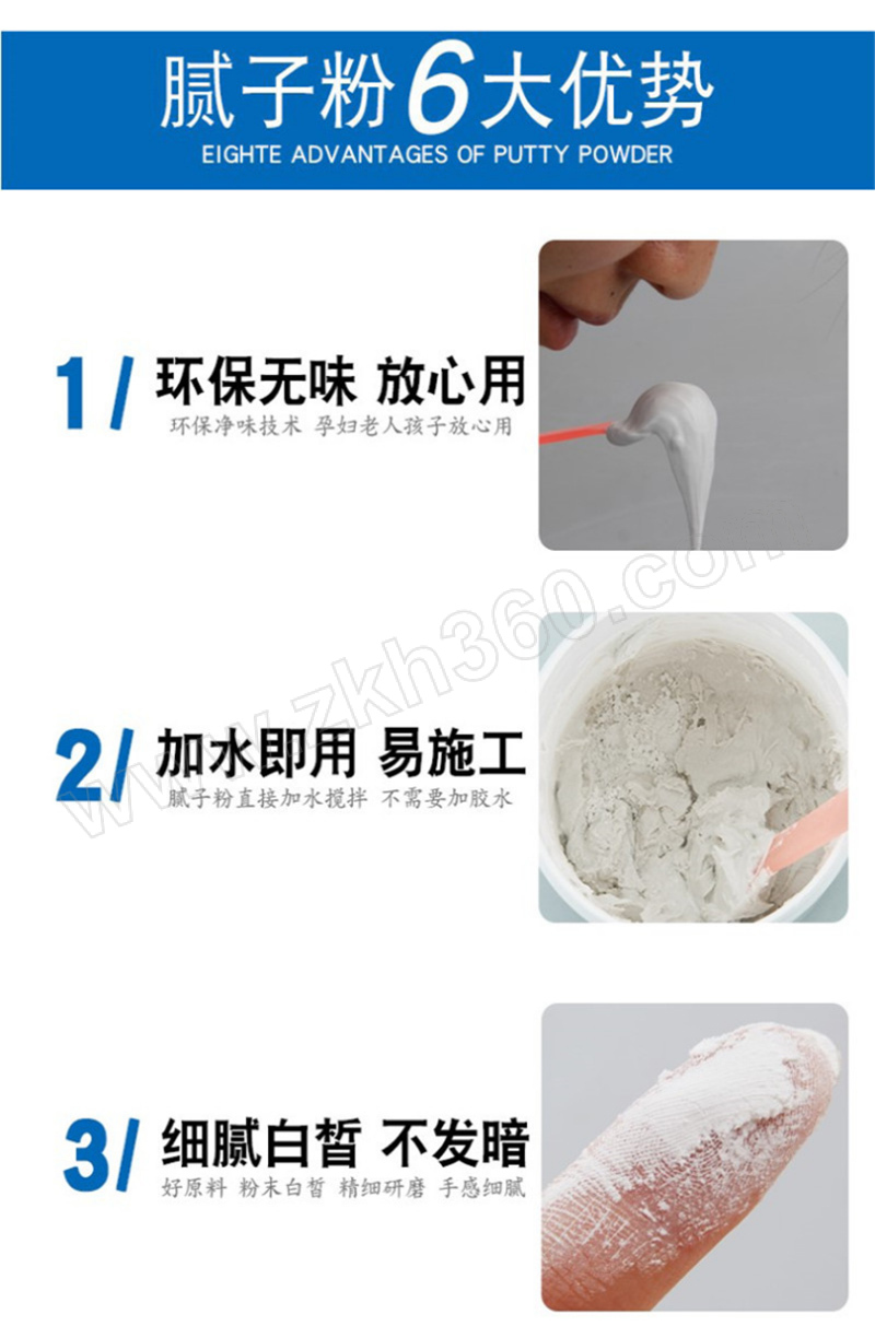 ·白色干粉腻子粉,细腻平滑,粘结强度高于基层结合牢固,耐久坚固。