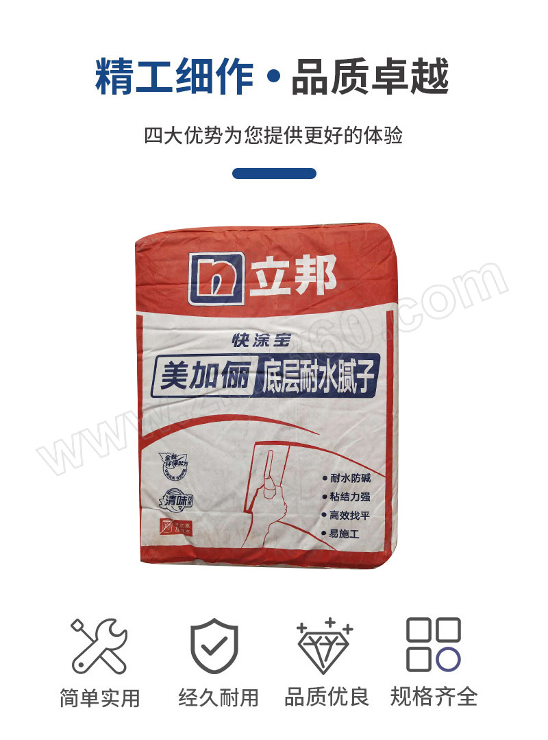 ·是采用优质天然粉料,添加特殊复合添加剂及耐水材料而制成的新型底层找平干粉腻子。 ·批刮后与基层结合牢固,耐水耐碱性佳。 ·开袋后加水搅拌即可使用,施工方便。 ·找平效率高,缩短工期。