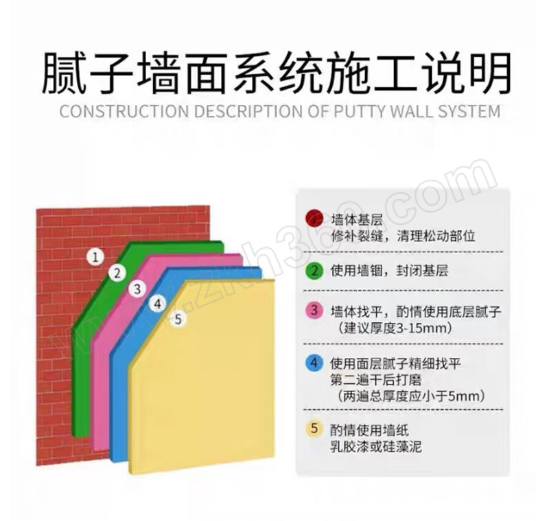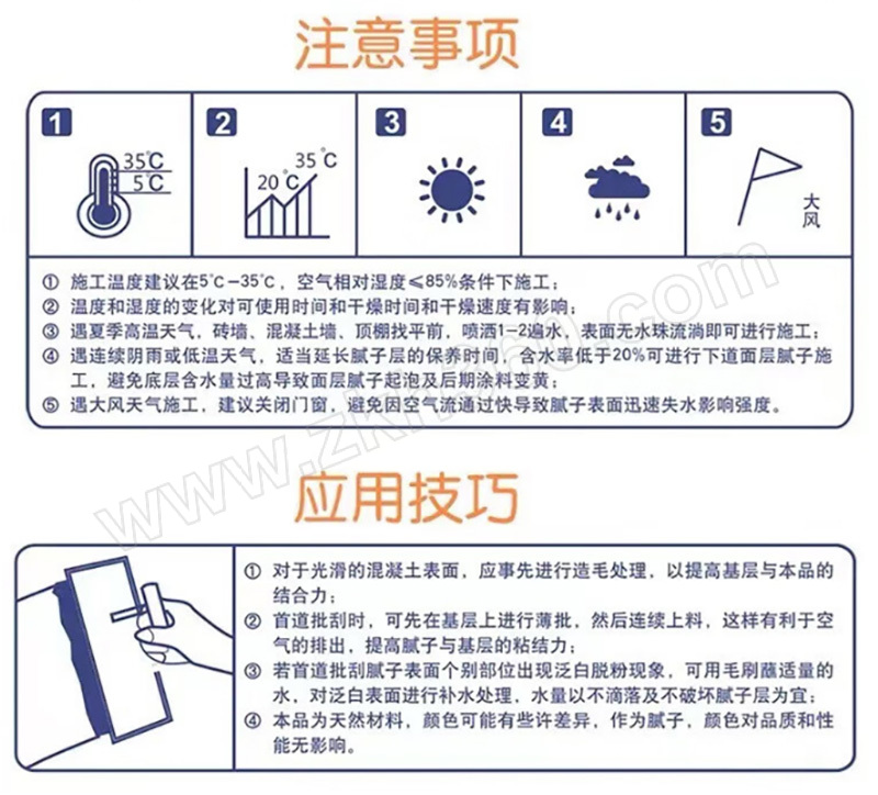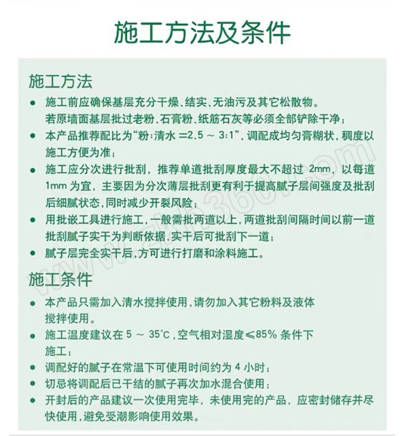 ·本品存放时应保证环境通风,干燥,贮存温度5℃-35℃ ·运输中严防日晒和水湿,保持包装完好。 ·墙体不平整,可以用底层粉打底,后需要面层粉过最后一次面 ·底层是有带颗粒的粉,起到易找平