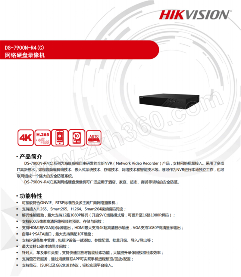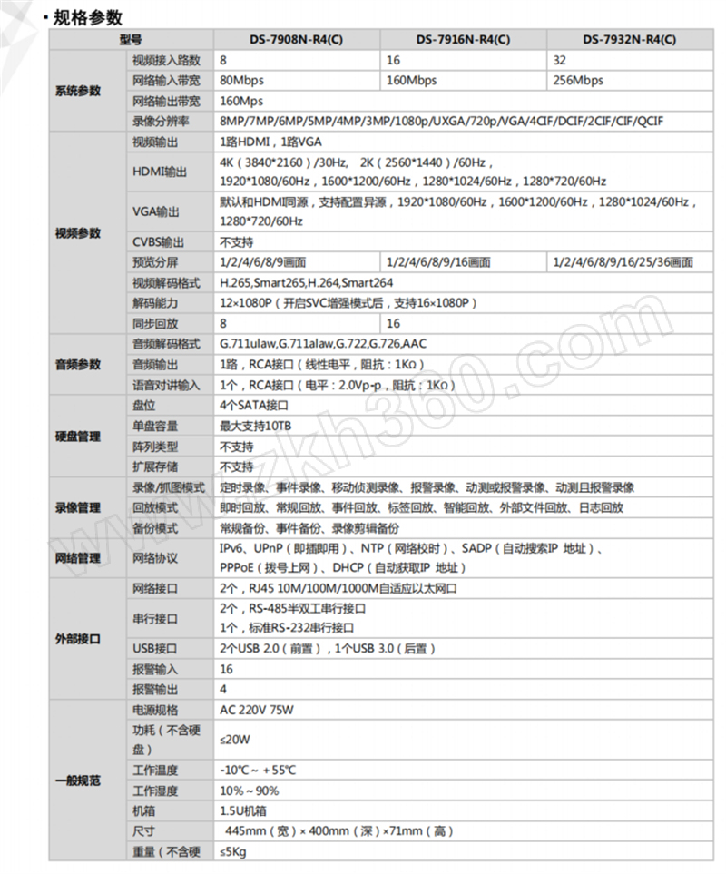 ·解码性能强劲,全系列支持8路1080P解码; ·专为高分辨率相机接入所打造,最大支持800万相机接入; ·硬盘支持全面升级,支持满配8T硬盘,进一步延长录像时间; ·平台接入协议丰富,支持萤石、Ehome以及GB28181协议,轻松实现平台接入; ·接口一应俱全,满足各类外设接入需求; ·1.5U 标准机箱,支持机架安装; ·4盘位,最大支持8TB硬盘 ·支持1个HDMI 4K输出 +1个VGA同源高清1080P输出 ·支持8路1080P解码 ·支持H.265、H.264混合解码,最大支持接入8MP高清IPC ·2个千兆网口 ·自带16进4出报警口 ·2个USB2.0接口+1个USB3.0接口