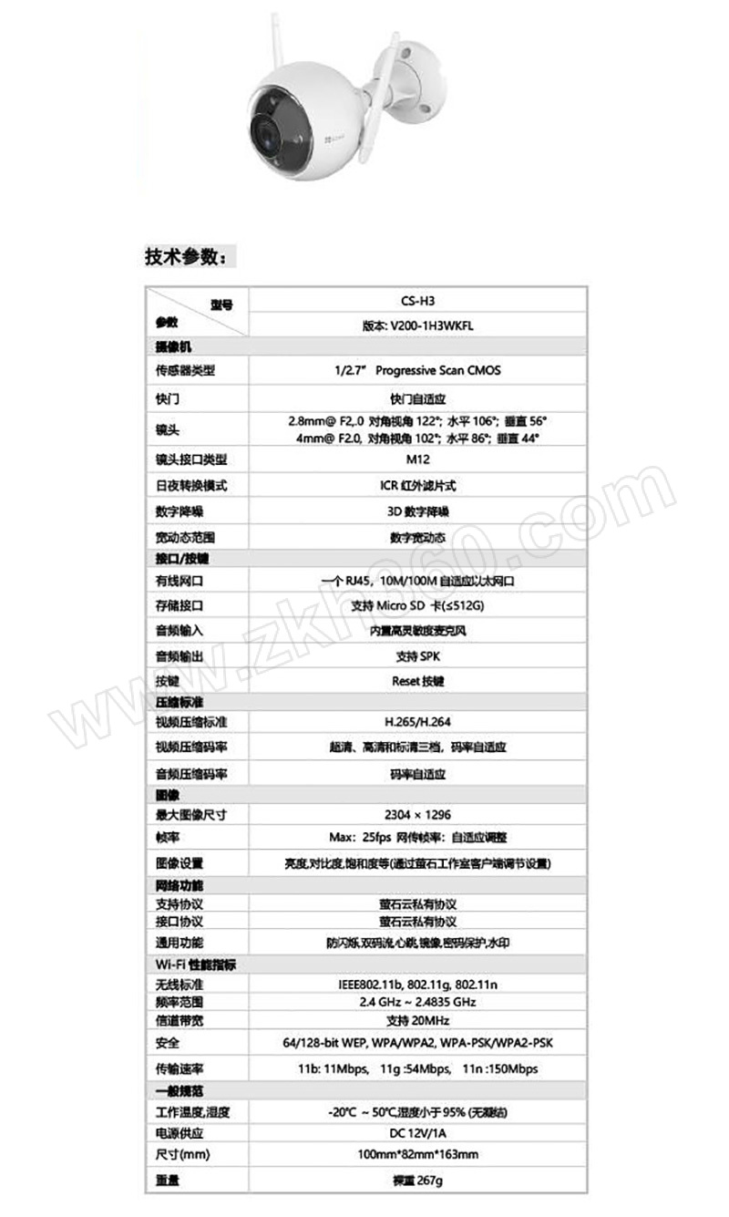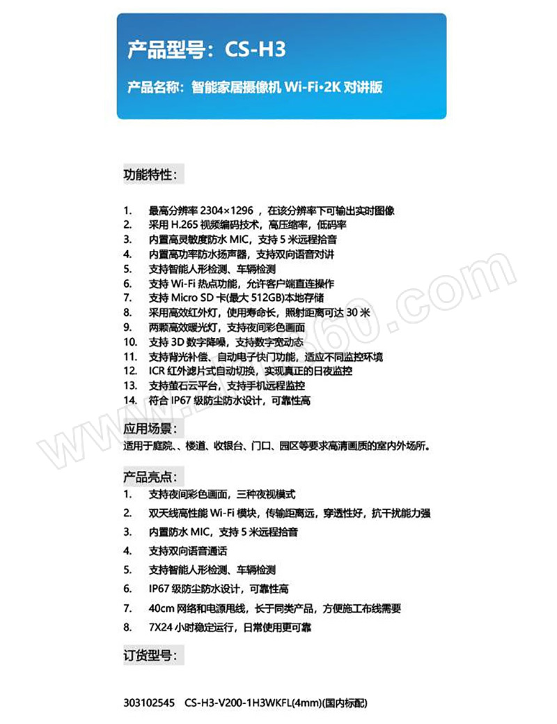 ·支持夜间彩色画面,三种夜视模式 ·双天线高性能Wi-Fi模块,传输距离远,穿透性好,抗干扰能力强 ·内置防水MIC,支持5米远程拾音 ·支持双向语音通话 ·支持智能人形检测,车辆检测 ·IP67级防尘防水设计,可靠性高 ·40cm网络和电源甩线,长于同类产品,方便施工布线需要 ·7X24小时稳定运行,日常使用更可靠