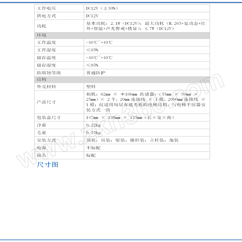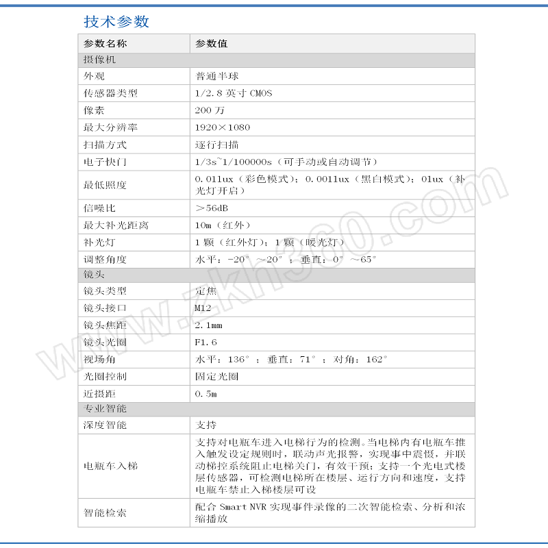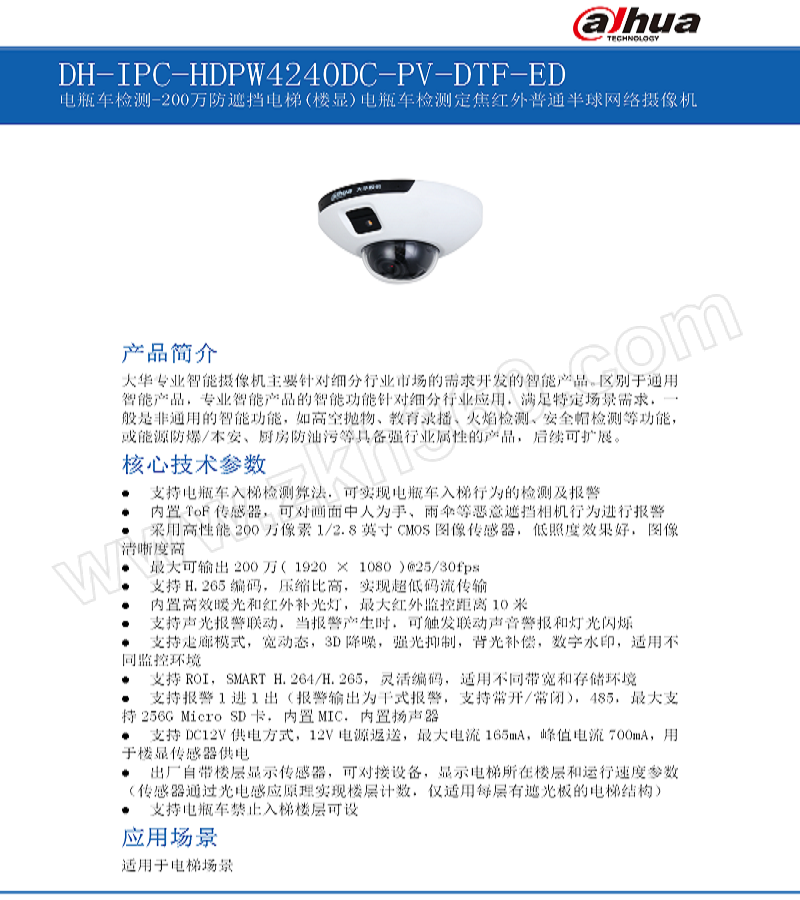 去购物车·支持电瓶车入梯检测算法,可实现电瓶车入梯行为的检测及报警 ·内置ToF传感器,可对画面中人为手、雨伞等恶意遮挡相机行为进行报警 ·采用高性能200万像素1/2.8英寸CMOS图像传感器,低照度效果好,图像清晰度高