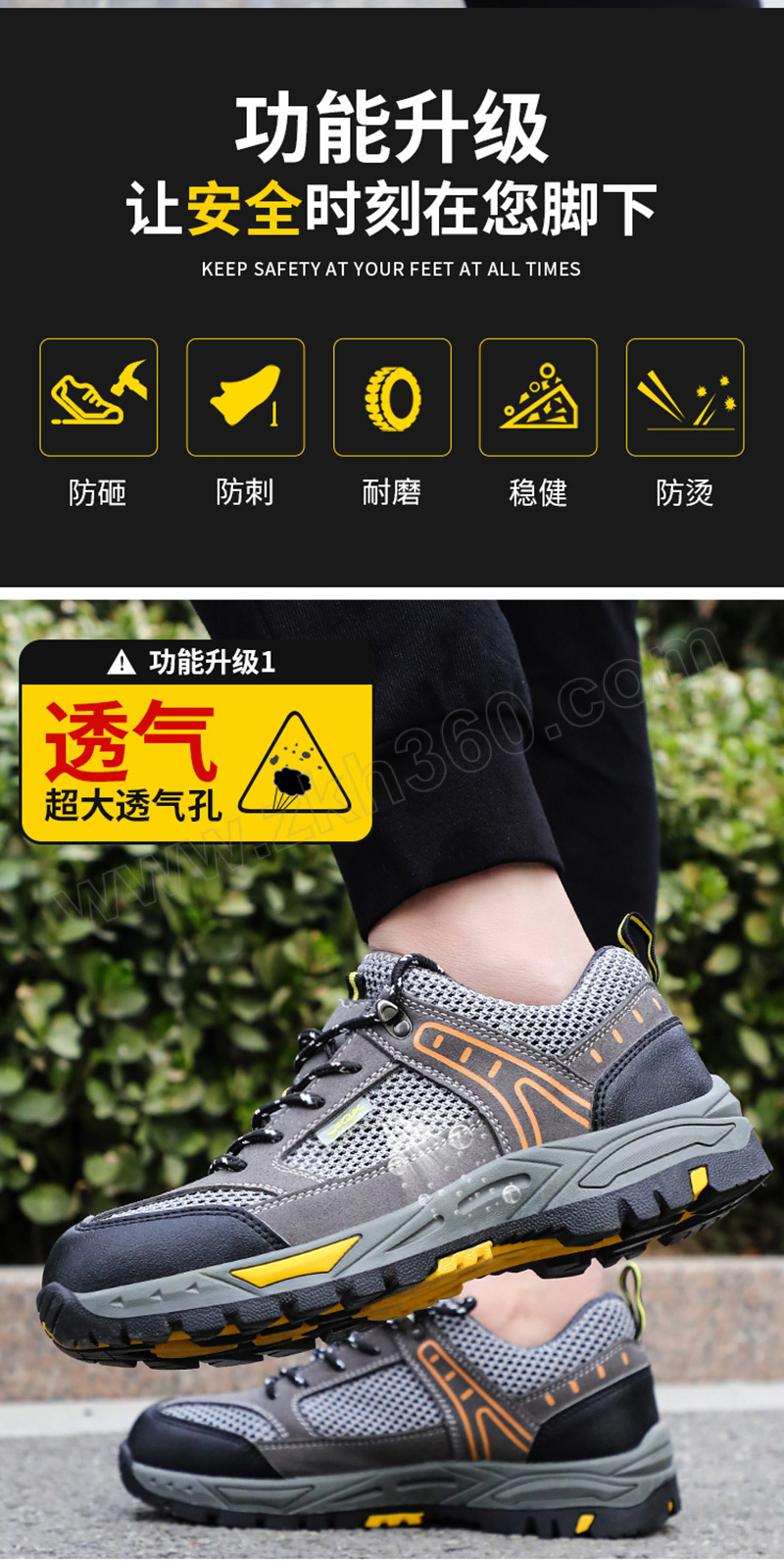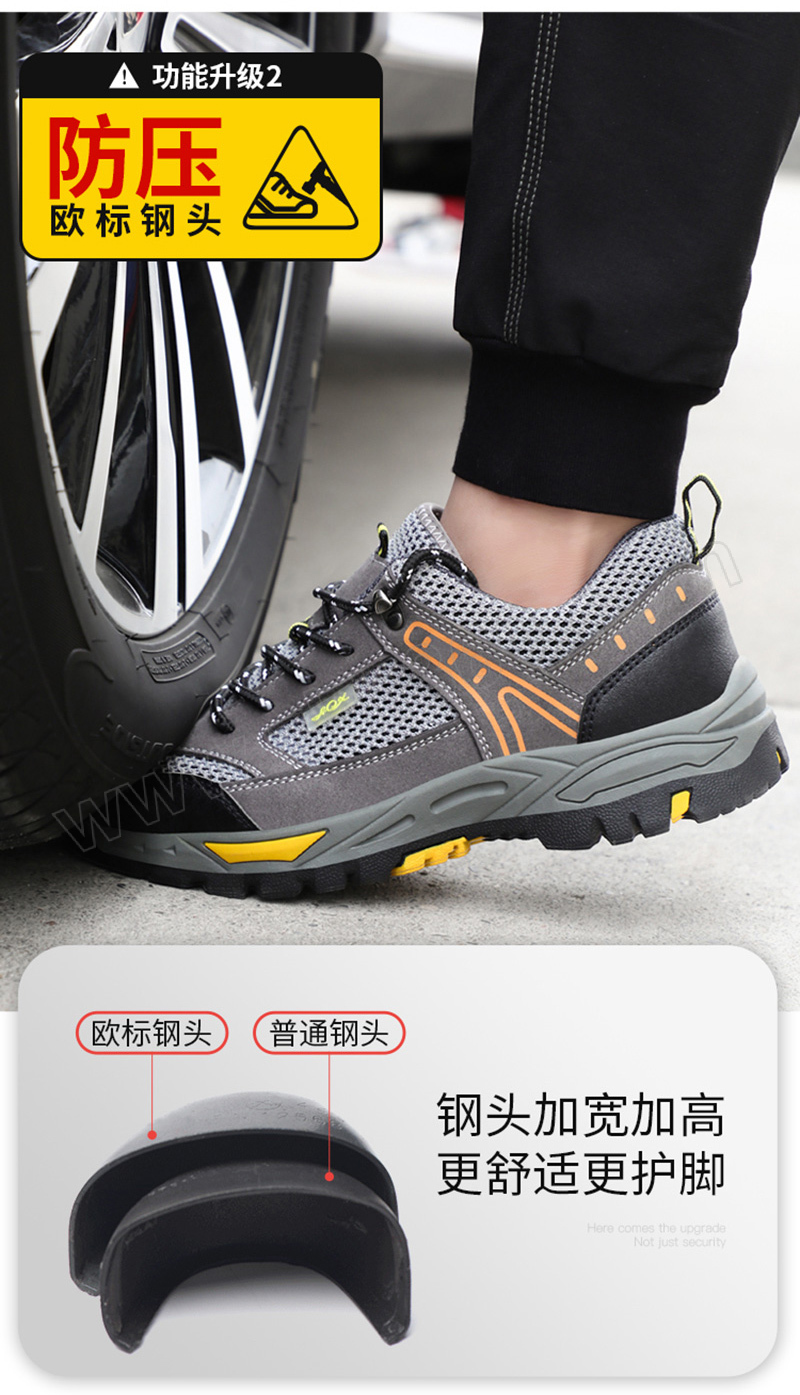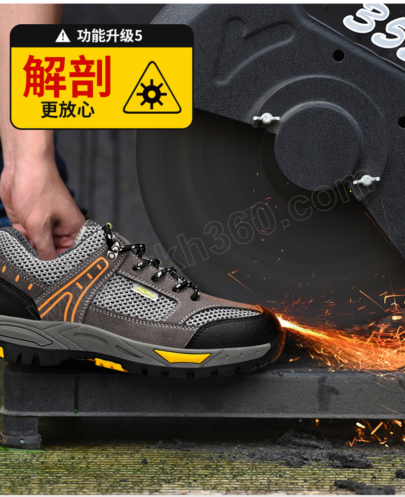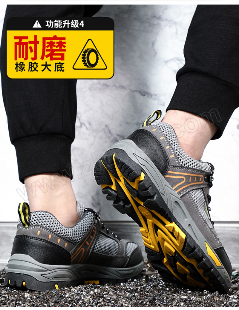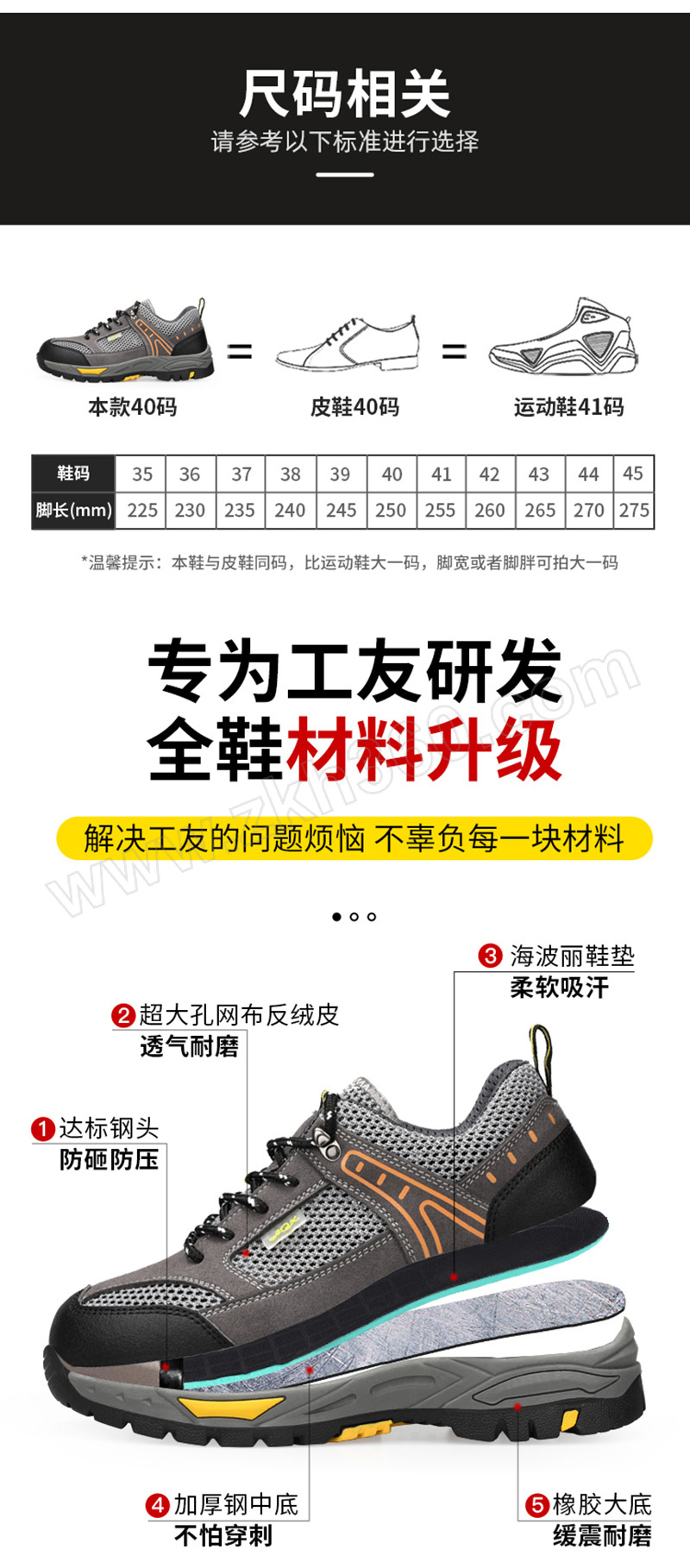 ·防砸防刺穿,鞋底耐磨橡胶底,透气大孔网布 ·鞋帮面皮料不耐强酸强碱,不耐重油,不适合重油污和强酸强碱环境使用
